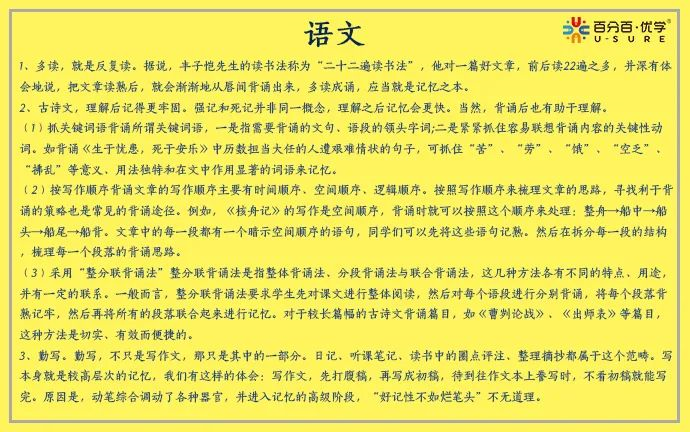 语文 1、多读,就是反复读。据说,丰子恺先生的读书法称为“二十二遍读书法”,他对一篇好文章,前后读22遍之多,并深有体会地说,把文章读熟后,就会渐渐地从唇间背诵出来,多读成诵,应当就是记忆之本。 2、古诗文,理解后记得更牢固。强记和死记并非同一概念,理解之后记忆会更快。当然,背诵后也有助于理解。 (1)抓关键词语背诵 所谓关键词语,一是指需要背诵的文句、语段的领头字词;二是紧紧抓住容易联想背诵内容的关键性动词。如背诵《生于忧患,死于安乐》中历数担当大任的人遭艰难情状的句子,可抓住“苦”、“劳”、“饿”、“空乏”、“拂乱”等意义、用法独特和在文中作用显著的词语来记忆。 (2)按写作顺序背诵 文章的写作顺序主要有时间顺序、空间顺序、逻辑顺序。按照写作顺序来梳理文章的思路,寻找利于背诵的策略也是常见的背诵途径。例如,《核舟记》的写作是空间顺序,背诵时就可以按照这个顺序来处理:整舟→船中→船头→船尾→船背。文章中的每一段都有一个暗示空间顺序的语句,同学们可以先将这些语句记熟。然后在拆分每一段的结构,梳理每一个段落的背诵思路。 (3)采用“整分联背诵法” 整分联背诵法是指整体背诵法、分段背诵法与联合背诵法,这几种方法各有不同的特点、用途,并有一定的联系。一般而言,整分联背诵法要求学生先对课文进行整体阅读,然后对每个语段进行分别背诵,将每个段落背熟记牢,然后再将所有的段落联合起来进行记忆。对于较长篇幅的古诗文背诵篇目,如《曹刿论战》、《出师表》等篇目,这种方法是切实、有效而便捷的。 3、勤写。勤写,不只是写作文,那只是其中的一部分。日记、听课笔记、读书中的圈点评注、整理摘抄都属于这个范畴。 写本身就是较高层次的记忆,我们有这样的体会:写作文,先打腹稿,再写成初稿,待到往作文本上誊写时,不看初稿就能写完。原因是,动笔综合调动了各种器官,并进入记忆的高级阶段,“好记性不如烂笔头”不无道理。