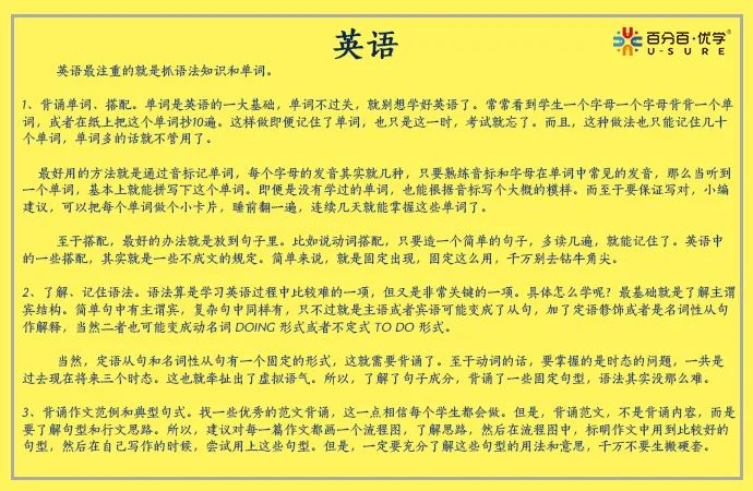 英语 英语*注重的就是抓语法知识和单词。 1、背诵单词、搭配。单词是英语的一大基础,单词不过关,就别想学好英语了。常常看到学生一个字母一个字母背背一个单词,或者在纸上把这个单词抄10遍。这样做即便记住了单词,也只是这一时,考试就忘了。而且,这种做法也只能记住几十个单词,单词多的话就不管用了。 *好用的方法就是通过音标记单词,每个字母的发音其实就几种,只要熟练音标和字母在单词中常见的发音,那么当听到一个单词,基本上就能拼写下这个单词。即便是没有学过的单词,也能根据音标写个大概的模样。而至于要保证写对,小编建议,可以把每个单词做个小卡片,睡前翻一遍,连续几天就能掌握这些单词了。 至于搭配,*好的办法就是放到句子里。比如说动词搭配,只要造一个简单的句子,多读几遍,就能记住了。英语中的一些搭配,其实就是一些不成文的规定。简单来说,就是固定出现,固定这么用,千万别去钻牛角尖。 2、了解、记住语法。语法算是学习英语过程中比较难的一项,但又是非常关键的一项。具体怎么学呢?*基础就是了解主谓宾结构。简单句中有主谓宾,复杂句中同样有,只不过就是主语或者宾语可能变成了从句,加了定语修饰或者是名词性从句作解释,当然二者也可能变成动名词 doing 形式或者不定式 to do 形式。 当然,定语从句和名词性从句有一个固定的形式,这就需要背诵了。至于动词的话,要掌握的是时态的问题,一共是过去现在将来三个时态。这也就牵扯出了虚拟语气。所以,了解了句子成分,背诵了一些固定句型,语法其实没那么难。 3、背诵作文范例和典型句式。找一些优秀的范文背诵,这一点相信每个学生都会做。但是,背诵范文,不是背诵内容,而是要了解句型和行文思路。所以,建议对每一篇作文都画一个流程图,了解思路,然后在流程图中,标明作文中用到比较好的句型,然后在自己写作的时候,尝试用上这些句型。但是,一定要充分了解这些句型的用法和意思,千万不要生搬硬套。