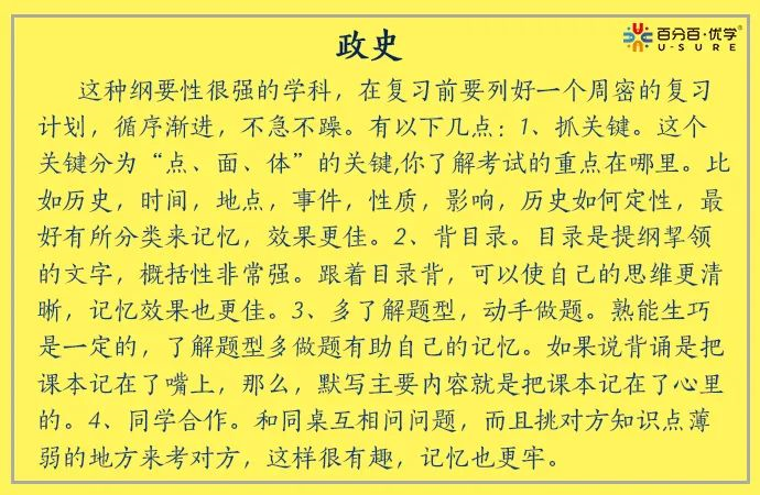 政史 这种纲要性很强的学科,在复习前要列好一个周密的复习计划,循序渐进,不急不躁。有以下几点: 2、背目录。目录是提纲挈领的文字,概括性非常强。跟着目录背,可以使自己的思维更清晰,记忆效果也更佳。 3、多了解题型,动手做题。熟能生巧是一定的,了解题型多做题有助自己的记忆。如果说背诵是把课本记在了嘴上,那么,默写主要内容就是把课本记在了心里的。 4、同学合作。和同桌互相问问题,而且挑对方知识点薄弱的地方来考对方,这样很有趣,记忆也更牢。