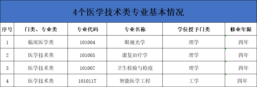 下面来展开介绍这4个专业,快接着往下看~ 一、眼视光学 1、专业简介 名字乍一听非常学术,但实际上却是我们生活中经常能接触到的,比如验光配镜、眼科检查以及视力矫正等,这些都是眼视光学在我们日常生活中的应用。这是一门以保护人眼视觉健康为主要内容的医学领域,是以眼科学和视光学为主,结合现代医学、应用光学、生物医学工程等知识所构成的一门专业性强、涉及面广的交叉,通过光学、药物及其他方法来诊断、治疗和预防相关疾病和障碍,达到增进视力、完善视功能的目的。 2、就业前景 眼视光学专业在我国有着广阔的就业前景。近三年就业率高。 我国近视、弱视、低视力等发病人数均高于世界平均水平。而同时,我国眼镜不合格率高,亟需高素质人才来提高眼镜产品的质量。视觉检查、诊疗、人才培养等都离不开眼视光学专业人员,因此眼视光学学生的社会需求大,就业机会多。 眼视光学专业由于开设高校很少,各校招生人数也非常有限,所以毕业生就业上基本不存在竞争问题。就业上基本没有地域差异,全国各地都有大量需要配戴眼镜、矫正视力的人群,是一个回报较大的职业。 就业方向主要在各级综合医院、专科医院从事检查技师、验光师、培训师工作;在眼视光学相关公司与企业从事培训、销售工作;在眼视光学器械生产单位从事研发工作;在高等院校、科研机构等单位从事教学、科研工作。 3、推荐院校 天津医科大学、天津医科大学临床医学院、山西医科大学、南京医科大学 二、康复治疗学 1、专业简介 临床医学主要针对的是疾病,但现在大多数疾病是不可能完全治愈的。例如*常见的心脑血管病和骨关节病等,患者不得不带着疾病状态或疾病造成的后遗症继续生存下去。而康复治疗学正是治疗这类疾病的医学技术,针对疾病和损伤所导致的功能障碍,使病人尽可能在身体上和精神上恢复或接近正常状态。 康复治疗学通过作业疗法、言语疗法、心理疗法等康复治疗技术,治疗患者的失语症、语音发育迟缓、口吃、耳聋等疾病;通过假肢、轮椅、矫形器、助听辅具等辅助器械,帮助患者恢复或替代一部分身体机能,保证其正常生活;通过物理疗法、针灸推拿、骨伤康复、筋伤康复等治疗技术,帮助病人肌肉、关节功能的复健,特别是对体育运动员、体能训练者等人群的肌肉拉伤、骨折、筋伤、关节损伤等运动伤病进行康复治疗。 2、就业前景 康复治疗师目前缺口大、社会需求量多、学生毕业前景好、选择丰富。毕业生可在各级综合性医院康复医、康复医院、社区医院等从事康复治疗师技术工作,在疗养院、保健中心、运动队医务室、社区卫生服务机构等从事康复治疗或康复评定及预防保健等工作,也可选择康复治疗的教学、管理、科研与跨文化交流工作。 3、推荐院校 四川大学、吉林大学、天津医科大学、首都医科大学、郑州大学等 三、卫生检验与检疫 1、专业简介 卫生检验与检疫是公共卫生与预防医学体系的重要组成部分,被誉为预防医学的前哨和眼睛。包括卫生检验和卫生检疫,两个范畴。卫生检验即依据国家标准,建立与健康相关的化学物质和病原微生物检验方法、开发新型检验仪器和制定环境危害因素的监测方案。包括卫生理化检验和卫生微生物检验。卫生检疫即在国家授权下,对出入境商品及人员进行检查、监督、管理和公正鉴定的过程。 2、就业前景 该专业的主要就业去向就是进入国家机关,因为我国对于检验检疫行业基本都是垄断的。毕业生可以选择去海关、检验检疫局、卫生监督中心等单位从事检验检疫工作,这些单位大多都有编制,工作稳定,福利待遇都比较不错,可以说这是一个非常适合考公务员的专业。不过近年来随着公务员考试竞争激烈程度的加剧,对于毕业生的要求也变得越来越高,大部分本科毕业生都会选择继续深造,他们可选择的研究方向有微生物检验与检疫、理化检验与检疫、国境卫生检验与检疫、实时分析与监测技术、生物传感器等。 3、推荐院校 四川大学、首都医科大学、南京医科大学、广东医科大学、重庆医科大学等。 四、智能医学工程 1、专业简介 智能医学工程一门新兴的医、理、工高度交叉的,按照“医教研一体,医理工融合”的建设思路,紧密结合医疗健康与人工智能、机器人、大数据等新兴产业,把临床需求作为出发点和落脚点,布局医学与智能的交叉融合、转化创新,打通医学从“实验室”到“手术台”的通路桥梁。 智能医学工程强调新兴智能技术在医学中的应用,包括医学数据的智能感知、智能分析和智能决策,其研究内容包括智能药物研发、医疗机器人、智能诊疗、智能影像识别、智能健康数据管理等。旨在建立一个跨学科、多元化的教学和科研平台,促进各交叉融合,进而培养出适应时代发展的综合性高素质人才。 2、就业前景 随着智能科技、机器人和大数据技术的快速发展,特别是5G网络的推广应用,医学与人工智能相结合,将会给医学带来更多的科技革新以及便捷化。智能医学的发展理念十分契合我国现阶段医疗资源短缺且分布不均、老龄化日益严重的现状。因此,智能医学具有广阔的市场前景。 智能医学工程专业的主要就业方向:(1)面向人工智能、智慧医疗与远程医疗等相关企业,从事智能医学影像、智能诊疗、智能医用机器人、智能医学