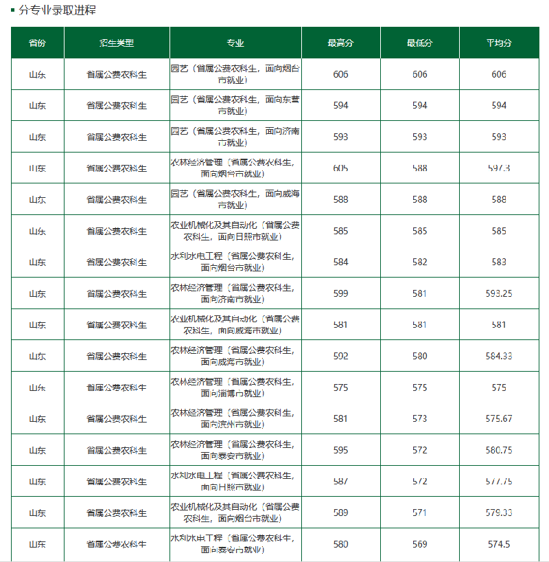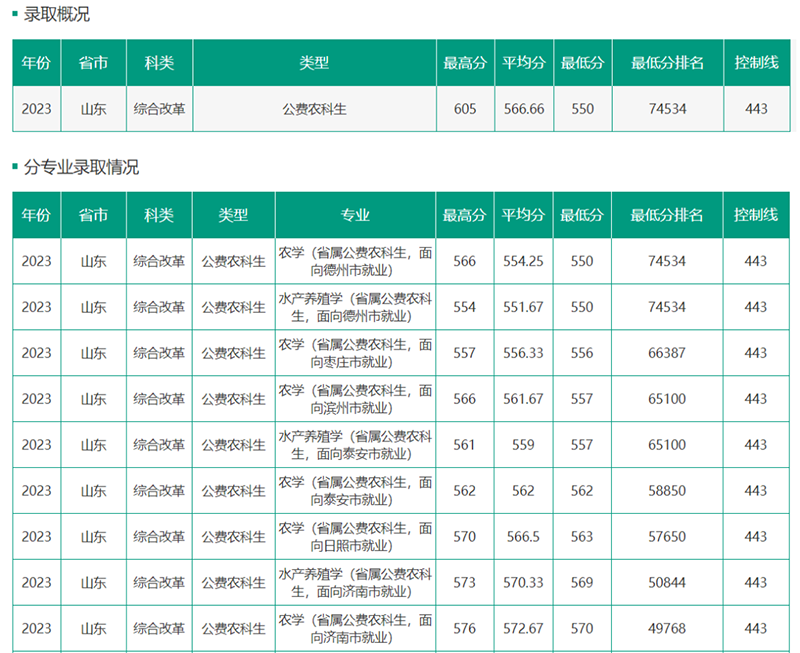 2023年鲁东大学公费农科生投档分数高的专业为农学(面向东营市就业)(高分605分),山东农业工程学院投档分数高的专业为农业经济管理(面向济南市就业)(高分569分,低分568分)。