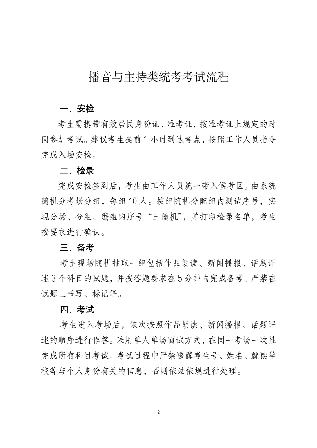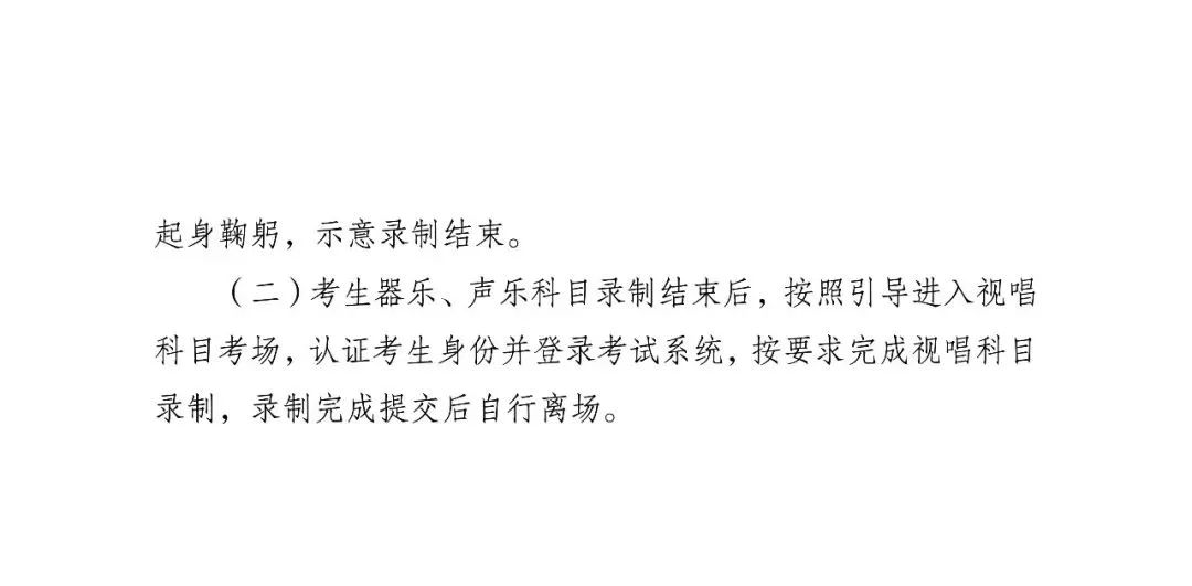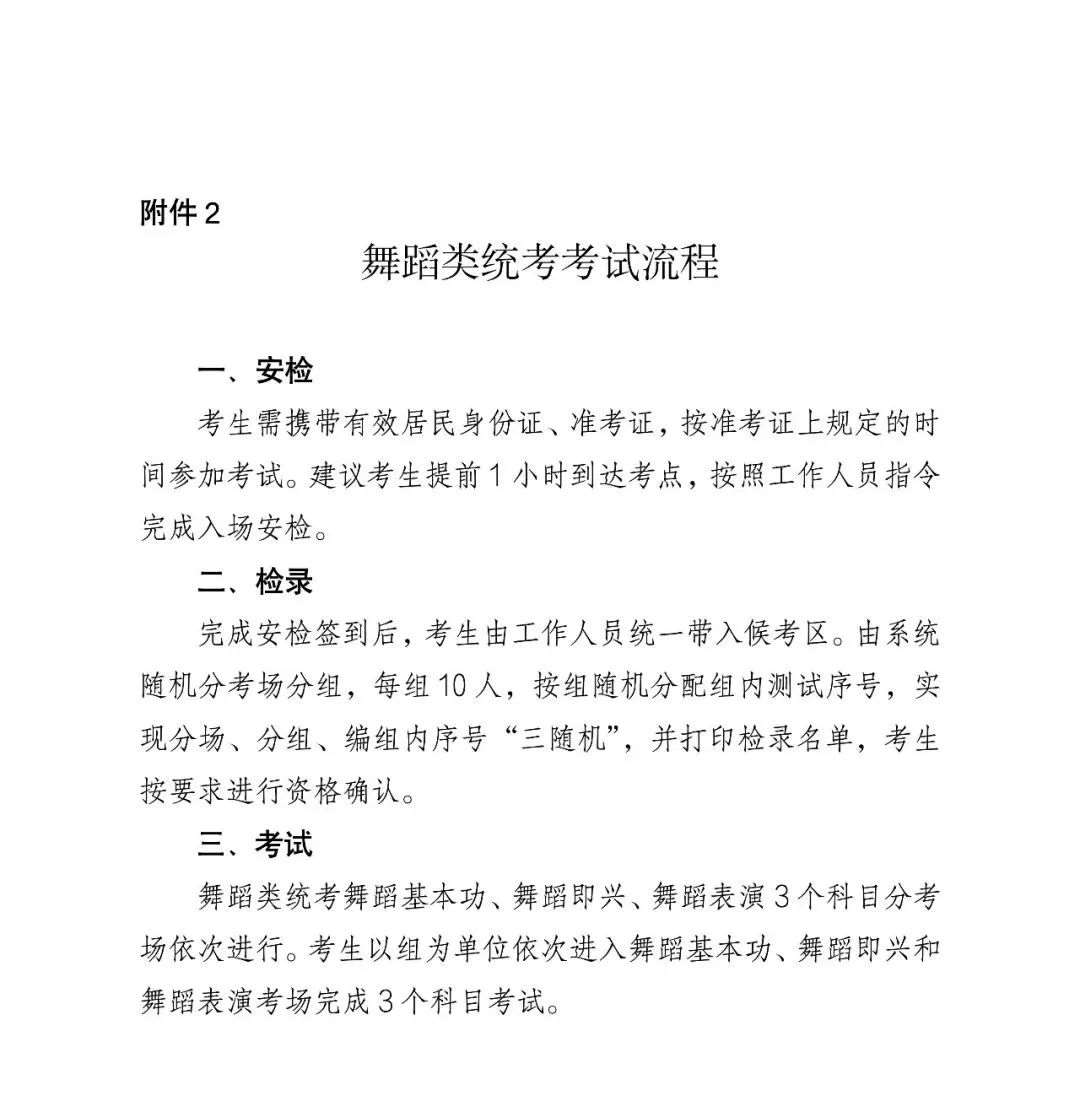 笔试科目开考后禁止考生进入考点参加当次科目考试。考生应牢记各科目考试时间,并在规定时间内接受入场检查。要按照考试(录制)流程(附件2)参加现场测试各专业统考,严格遵守考试秩序和纪律,妆容要符合考试说明中的要求。舞蹈类、播音与主持类、表(导)演类统考现场测试结束后,考生现场签字并领取考试*告知单,*告知单包含考生号、姓名及各科目*(按百分制评分),考生如对本人现场测试*有疑问,须在领取*告知单时向考点申请复查。音乐类统考考生对本人现场录制过程中遇到的问题,请务必在离开考场前提出申请。
