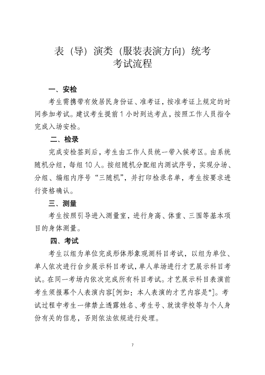 3.现场测试服装要求。参加舞蹈类、播音与主持类、音乐类、表(导)演类统考的考生要按照各类别考试说明中的要求,提前准备考试着装,注意服装不得有标志身份信息的特殊logo或图案。其中:
